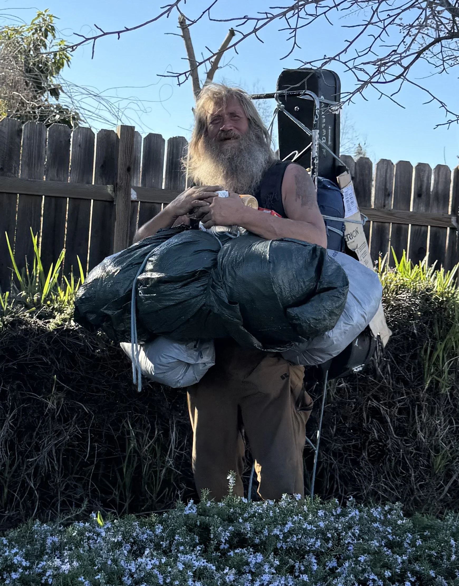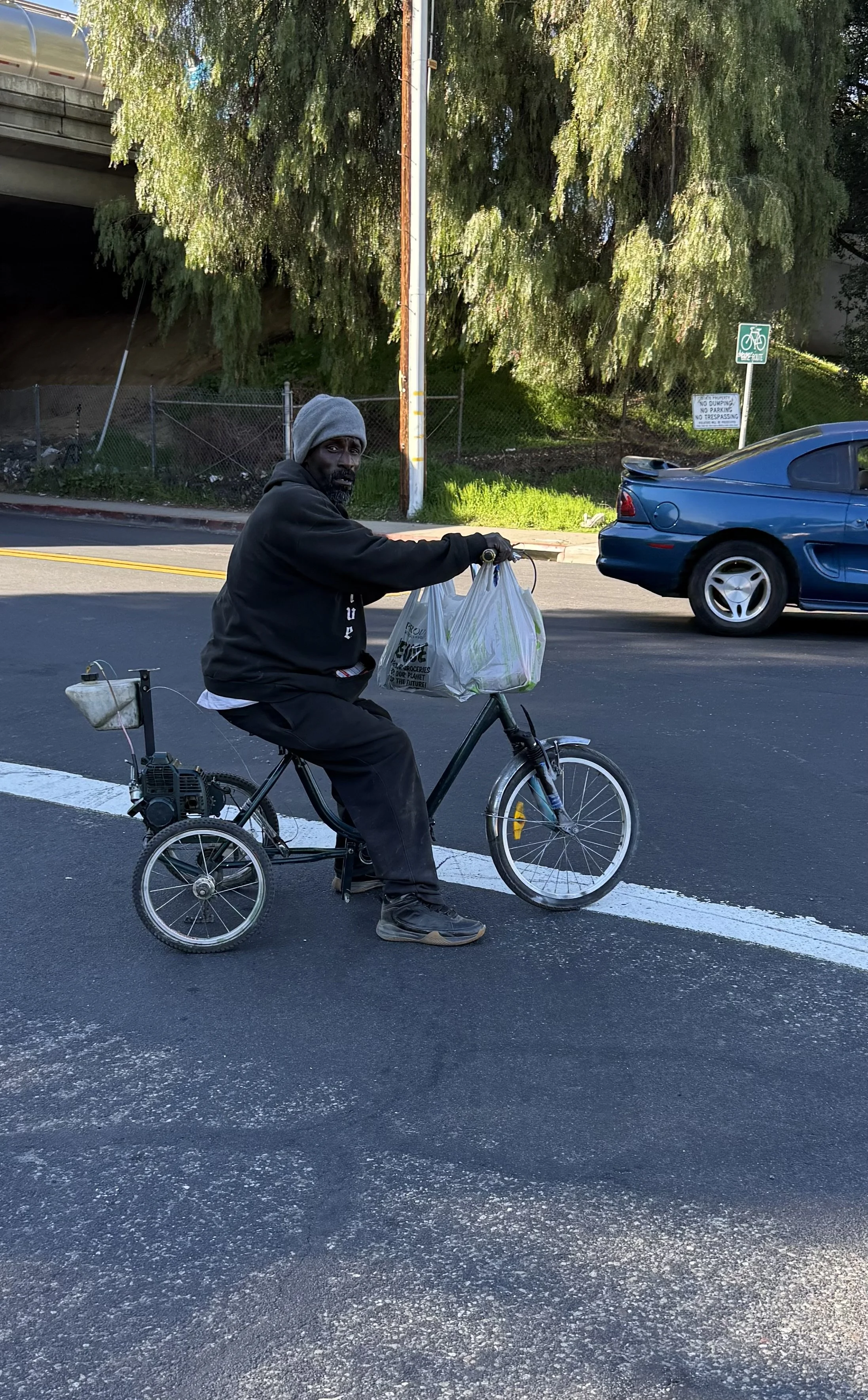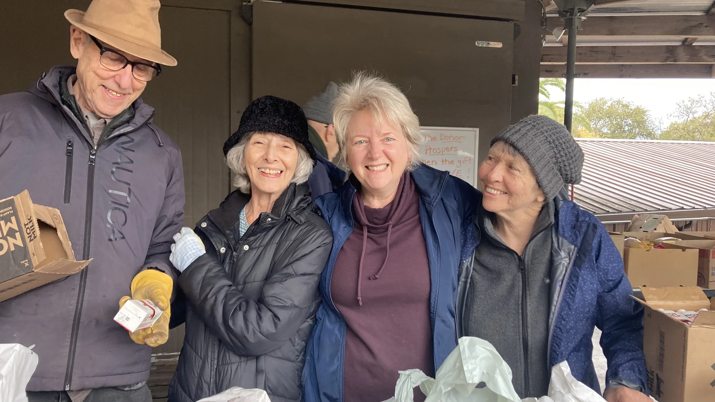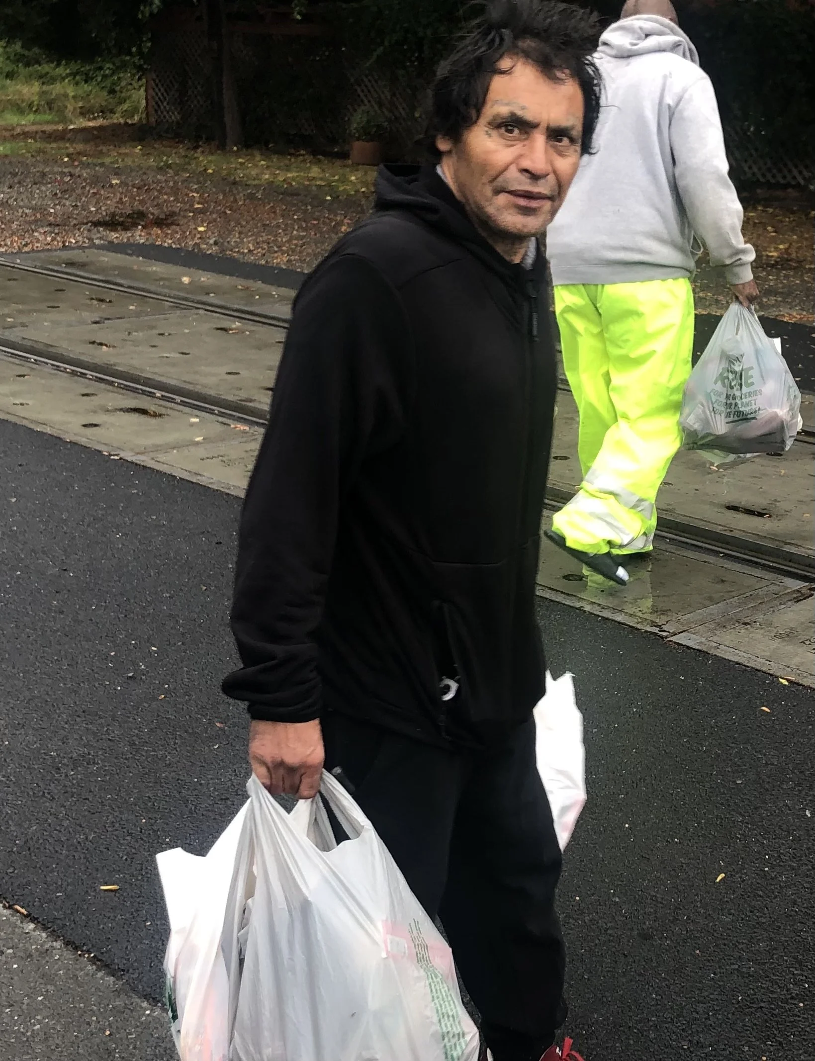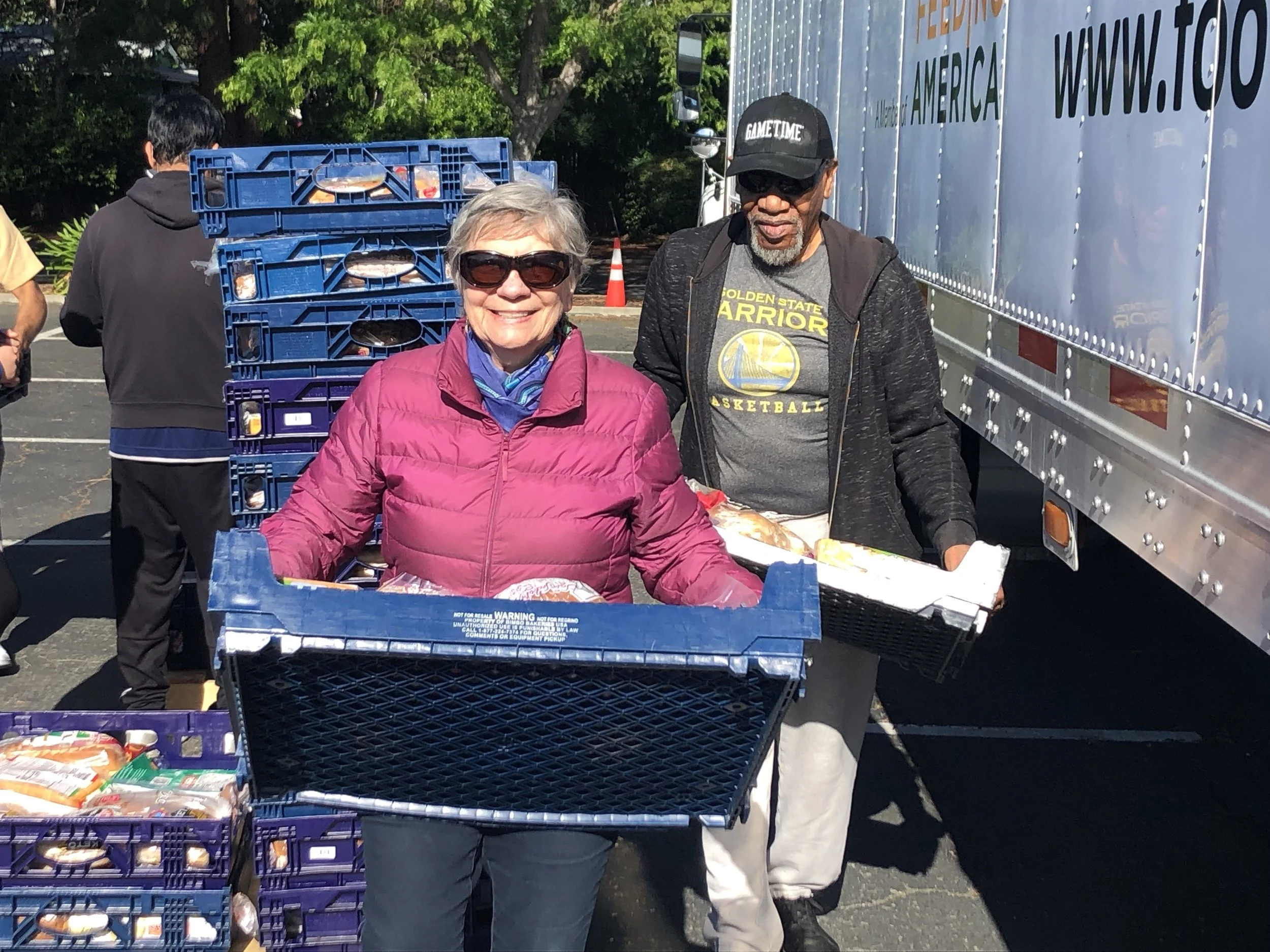 Volunteer hands a food bag to an unhoused person in Richmond, CA